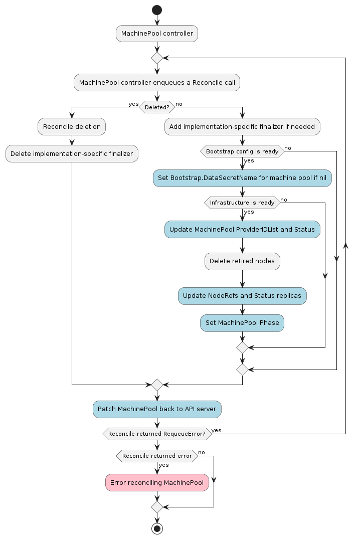 - Keeping the MachinePool’s Status object up to date with the InfrastructureMachinePool’s Status object.